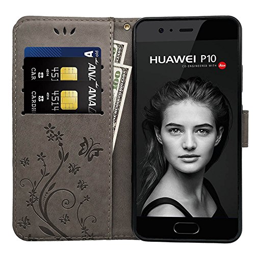 KUAWEI Cover per Huawei P10 in pelle per Huawei P10 con funzione di supporto e slot per carte a portafoglio, multiuso, a protezione completa (grigio)