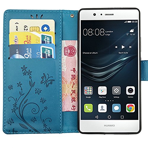 KUAWEI Custodia Huawei P9 Lite 2016 Flip Cover Custodia in Pelle con Magnetico Snap-on Carte Slot Credito Portafoglio Supporto Stand Full Body Protettivo Caso Copertina Pelle (Azzurro)