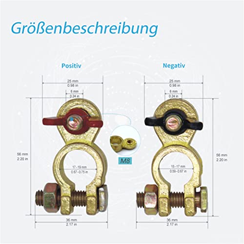 【Diametro del polo positivo della batteria】Il polo positivo del polo della batteria è 17-19 mm (0,67-0,75 pollici) e il polo negativo è 15-17 mm (0,59-0,67 pollici). Ci sono filettature M8 sui terminali, adatte per piastre batteria coniche positive o negative 12/24V per soddisfare le diverse esigenze.