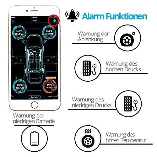 KUFUNG TPMS Bluetooth Tire Pressure Temperature Gauge Accurate Detection Monitoring Alarm with 4 External Sensors