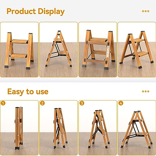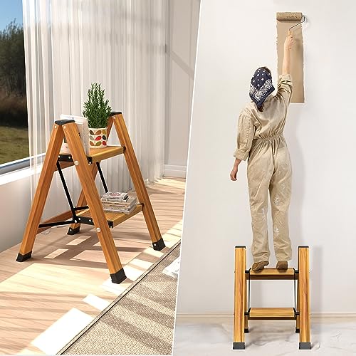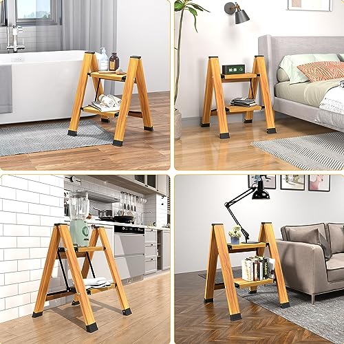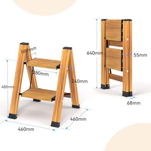 KULACO Sgabello Pieghevole Scala 2 Gradini Pieghevole in Alluminio Sgabello Portatile Antiscivolo Fino a 150 kg Scala Multifunzione Design Effetto Legno per Cucina Bagno Campeggio.