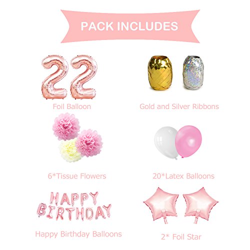 KUNGYO Rosa Oro Buon Compleanno Decorazioni Kit per 22 Anni Rose Gold Happy Birthday Bandiera Numero Gigante 22 e Stelle Palloncini Foil, Carta Pom Fiori, Forniture per Feste