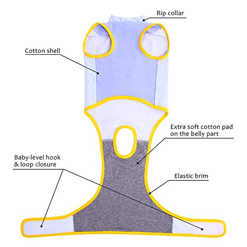 ♥ Design unico: lunghezza posteriore regolabile e nastro magico, questo può aiutarti a togliere/togliere facilmente la tuta di recupero. Ci sono spazio extra all'addome, in modo da poter mettere cose come il cuscinetto riscaldante. Il puro cotone addominale protegge perfettamente le lesioni del cane. Il sarto può essere arrotolato sotto l'addome e fissato con nastro magico.