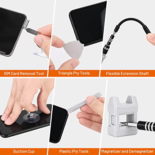 【Set Cacciaviti Professionale】Questi durevoli inserti per cacciavite sono realizzati in acciaio CRV, la cui durezza può raggiungere 55-60 HRC. La lunghezza dell'asta è regolabile e l'estensione flessibile può essere ruotata di 360°, le pinzette di precisione aiutano a raccogliere piccoli elementi di fissaggio, la ventosa e lo strumento di rimozione della scheda SIM sono ideali per telefoni e tablet.