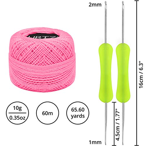 Kurtzy Gomitoli Cotone per Uncinetto Set (10 Filati x Uncinetto) - 2 Uncinetti Ergonomici Inclusi (1 mm, 2 mm) - Peso Gomitolo Cotone per Uncinetto (10 g) - Lunghezza Filo per Uncinetto Colorato 600 m