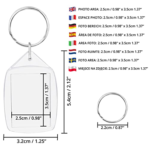 50 PORTACHIAVI PERSONALIZZABILI: Inclusi in questo set ci sono 50 portachiavi con foto personalizzabile. Ogni portachiavi plastica è realizzata in acrilico premium e misura 3,2 x 5,4 cm nel complesso. Questi portachiavi personalizzato con foto possono contenere immagini fino a 2,5 x 3,5 cm di grandezza. L'anello dei metallo ha un diametro di 2,2 cm.