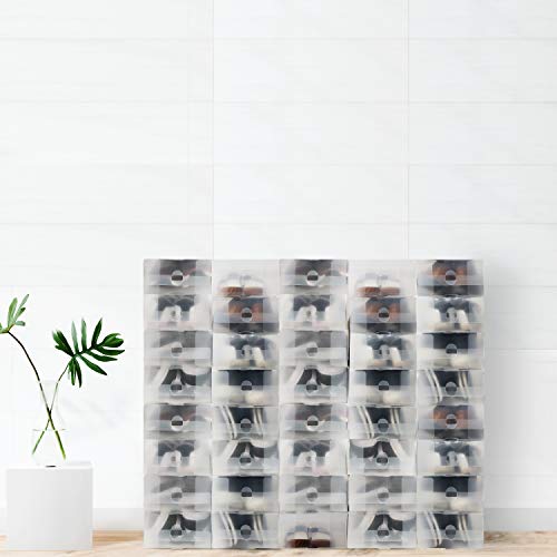 ORGANIZER PER SCARPE: Queste 40 porta scarpe da armadio sono perfette per la conservazione e l'organizzazione di scarpe. Arrivano appiattite, con istruzioni, e sono molto facili da assemblare. Una volta assemblata ogni scatola scarpe misura 30 x 9,5 x 18 cm. Possono conservare scarpe da uomo fino al n° 11,5 UK, 12 USA e 45 UE e scarpe femminili fino al n° 10 UK, 12 USA e 43 UE. Quando appiattite, i contenitori per scarpe trasparenti misurano 45 x 28 x 0,2 cm.