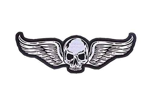 Questa toppa di teschio alato, in bianco e nero, è in tessuto ricamato.