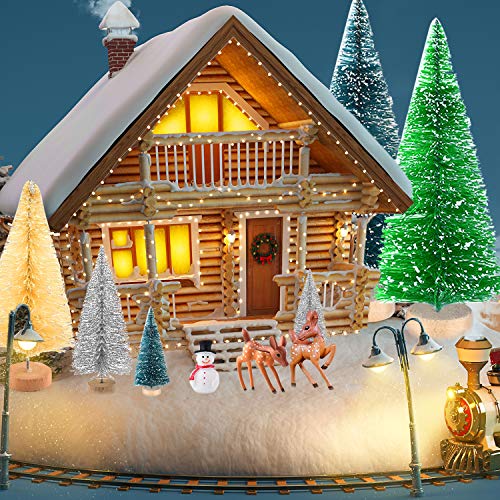 Mini alberi di pino con effetto neve, sono montati su una base di legno, lo fanno stare facilmente, creano la tua mini scena festiva del villaggio