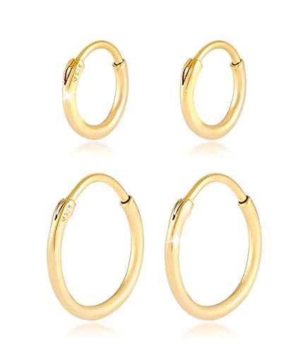 Kuzzoi, 4 orecchini a cerchio in argento (2 paia), rotondi, fatti a mano, orecchini basici, placcati oro, per uomo e donna