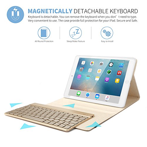 Custodia protettiva per iPad Air 2 in pelle sintetica in poliuretano. Design a triplo piegamento, la tastiera non toccherà lo schermo del tablet chiuso. Funzione auto sleep/wake. La confezione include una protezione schermo e un pennino capacitivo.
