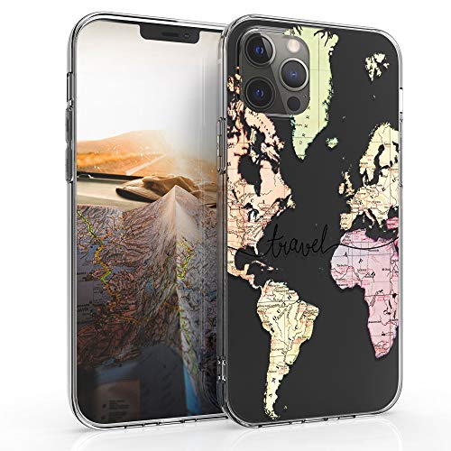 Kwmobile Custodia Compatibile con Apple iPhone 12 Pro Max - Cover Silicone TPU - Protezione Back Case - Mappa del mondo nero/multicolore/trasparente