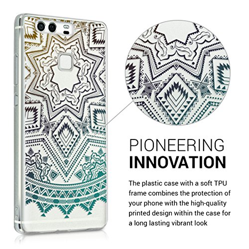 Kwmobile Custodia Compatibile con Huawei P9 - Cover Silicone TPU - Protezione Posteriore - Sole Azteco Giallo/Turchese/Trasparente