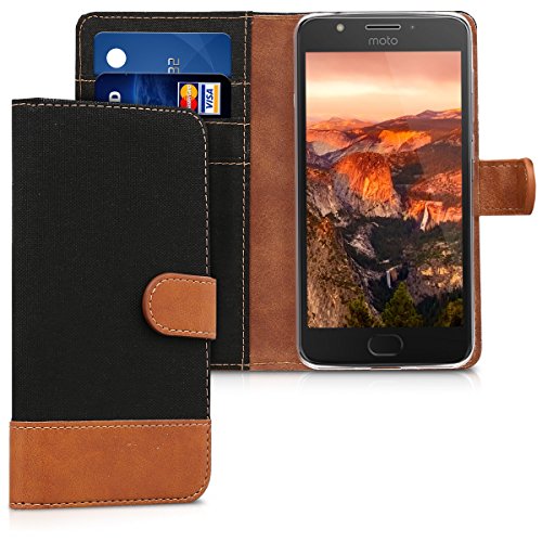 Kwmobile Custodia Compatibile con Motorola Moto E4 Cover Portafoglio - Case Chiusura Magnetica Portacarte Tessuto Similpelle nero/marrone