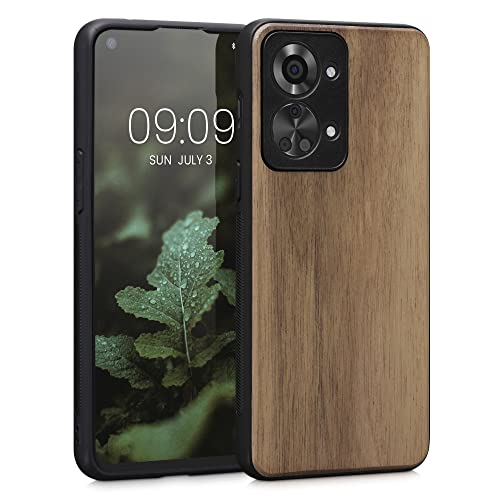 Kwmobile Custodia Compatibile con OnePlus Nord 2T 5G Cover - Protezione in Legno per Smartphone - Back Case con Bumper in Silicone TPU - Marrone Scuro