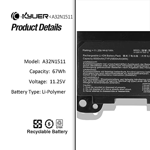 K KYUER 67Wh A32N1511 Laptop Batteria per ASUS ROG G752 G752V G752VL G752VM G752VT G752VY G752VW GFX72V GFX72VM GFX72VT G752VM-RB71 G752VT-DH72 G752VL-BHI7N32 G752VL-DH71 G752VL-GC085T GC057T A32LM9H