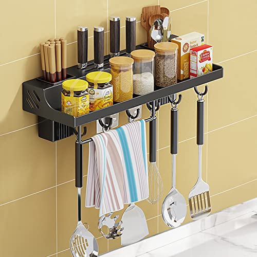 KYYLZ Scaffale per spezie, da parete, da cucina, senza foratura, con 6 ganci, in acciaio inox, nero, per cucina e bagno (40 cm)