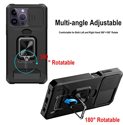 KZIOACSH Cover Compatibile con iPhone 14 PRO Max + Vetro Temperato[3 Pack],con Slot per Schede e Copertura per Lente Fotocamera Scorrevole,360°Rotante Anello Supporto,Nero