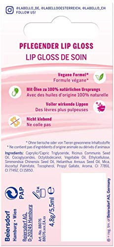 Contenuto della confezione e dettagli: Labello Lip Gloss per labbra lucide e curate, 5,5 ml, con oli naturali al 100%, numero di articolo 88076.