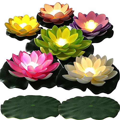 La confezione include: La luce galleggiante a LED del loto include 6 pezzi, 7 '' e 4,3 '' luce fiore di loto ogni dimensione per 3 pezzi, più 2 cuscinetti extra 6 '' ninfea. I colori del fiore di loto e del giglio sono freschi e sembrano naturali, non sbiadiscono mai sotto il sole o in acqua.