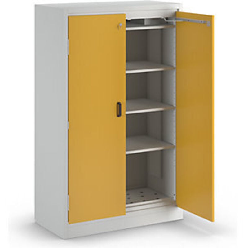 Armadio antincendio di tipo 30 per sostanze pericolose, a 2 ante, alt. x largh. x prof. 1935 x 1195 x 595 mm. Fornitura = montato. Resistenza alle fiamme = 30 minuti. Altezza = 1935 mm. Larghezza = 1195 mm. Profondità = 595 mm. Larghezza interna = 1075 mm. Altezza interna = 1600 mm. Profondità interna = 515 mm. Materiale = truciolato, difficilmente infiammabile (classificazione B1). Colore corpo = grigio chiaro RAL 7035. Colore porta = giallo narciso RAL 1007. Tipo di porta = anta a battente. Versione porta = a 2 ante. Serratura = serratura a cilindro. Numero ante = 2 pz. Numero ripiani = 3 pz. Materiale ripiani = lamiera d'acciaio. Portata per ripiano = 75 kg. Passo di regolazione altezza ripiani = 32 mm. Omologati per il magazzinaggio limitato di liquidi infiammabili nei luoghi di lavoro ai sensi di EN 14470-1 (tipo 30) e TRGS 510 (allegato 3). Resistenza alle fiamme di >30 minuti, modello testato, con collaudo GS. Chiusura automatica delle ante in caso d'incendio. Copertura in