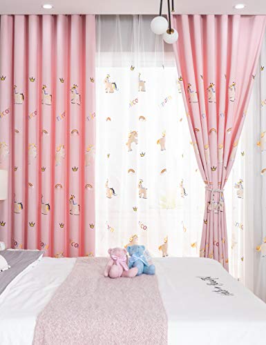Lactraum, tende per cameretta dei bambini, modello Principessa, ricamate con unicorno, corona, nuvola e arcobaleno, rosa, opache, con occhielli, 300 x 245 cm