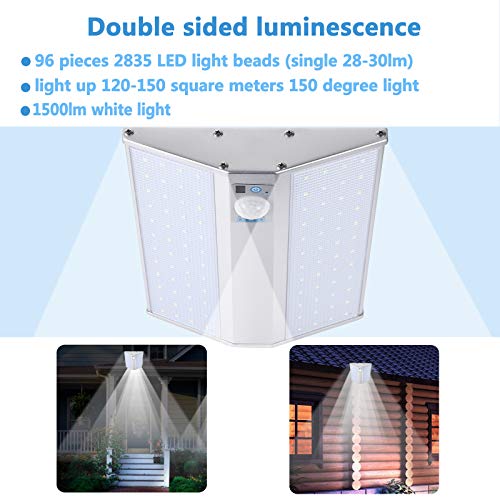Illuminazione super luminosa e ampia - Luci solari a 96 LED con lente di concentrazione ottica e emissione di luce a doppia faccia con illuminazione grandangolare a forma di V 150 ° coprono più aree di illuminazione, fornendo un'illuminazione super luminosa per te.