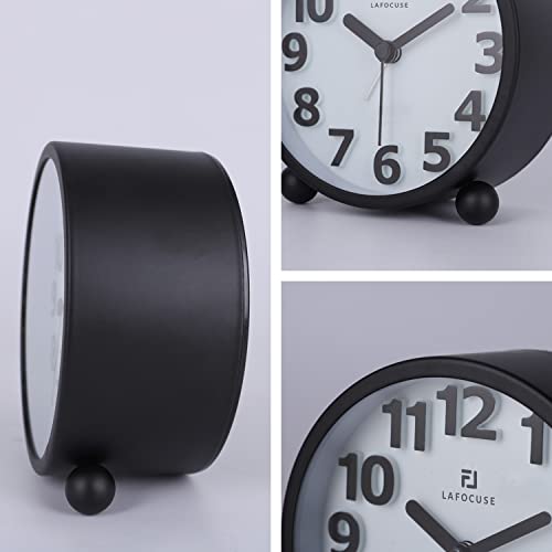 Lafocuse Metallo Sveglia Silenzioso con Luce Notturna, Snooze Sveglia da Comodino Analogico Nero Numeri 3D, Classico senza Ticchettio Orologi da Scrivania e da Scaffale 10.5cm