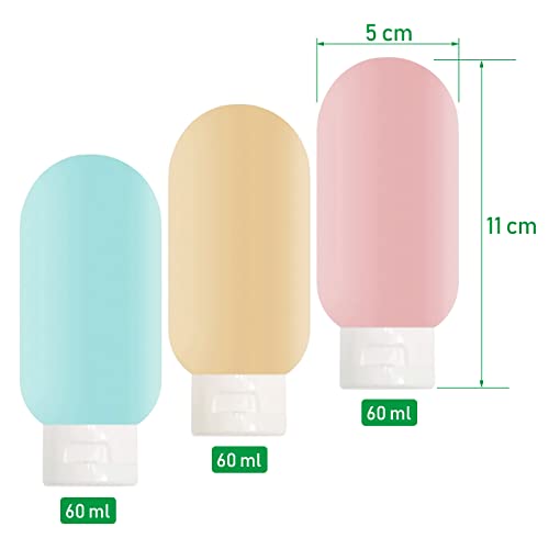 Value Pack: riceverete 3 pezzi di contenitori da viaggio portatili da 60 ml in diversi colori (verde, giallo, rosa) e 1 pezzo di carta per etichette. La dimensione della bottiglia da viaggio è 11,5*3,2 cm.