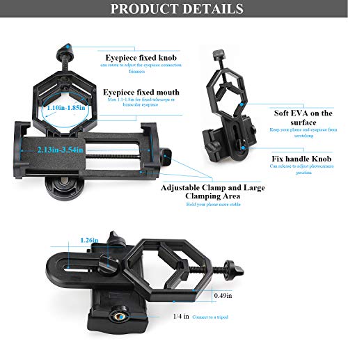 【Un Design comodo】- La superficie del telefono e l'oculare sono ricoperti da morbido materiale EVA. Esso mantiene la vostra attrezzatura senza graffi o danni. Il treppiede può essere collegato alla vite della porta dell'adattatore del telefono.