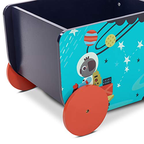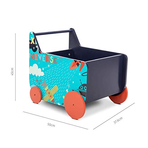 Lalaloom Space Wagon - Girello per Bambini in Legno, Blu, Carrello Primi Passi Passeggino, Giocattolo con Spazio, Baby Walker Mutifunzione, 50x37.6x45 cm