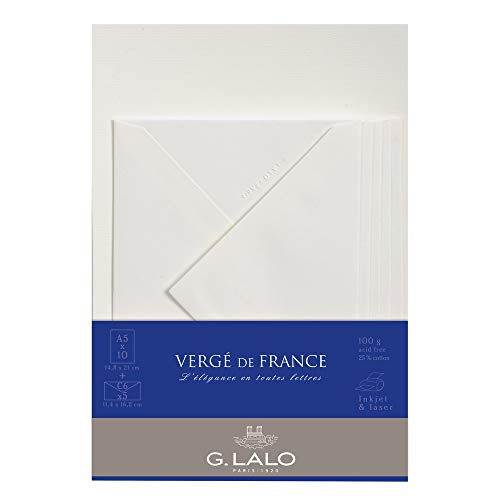 Lalo 61400L - Kit di 10 carta piegati le dette d'orato 5 100 g et 5 enveloppes gommées doublées 11.4 x 16.2 cm, Vergé de France, Blanc