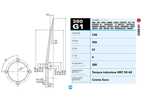 Lama affettatrice 350mm - foro centrale 57mm - 4 fori fissaggio - diametro incavo coprilama 280mm Materiale C45