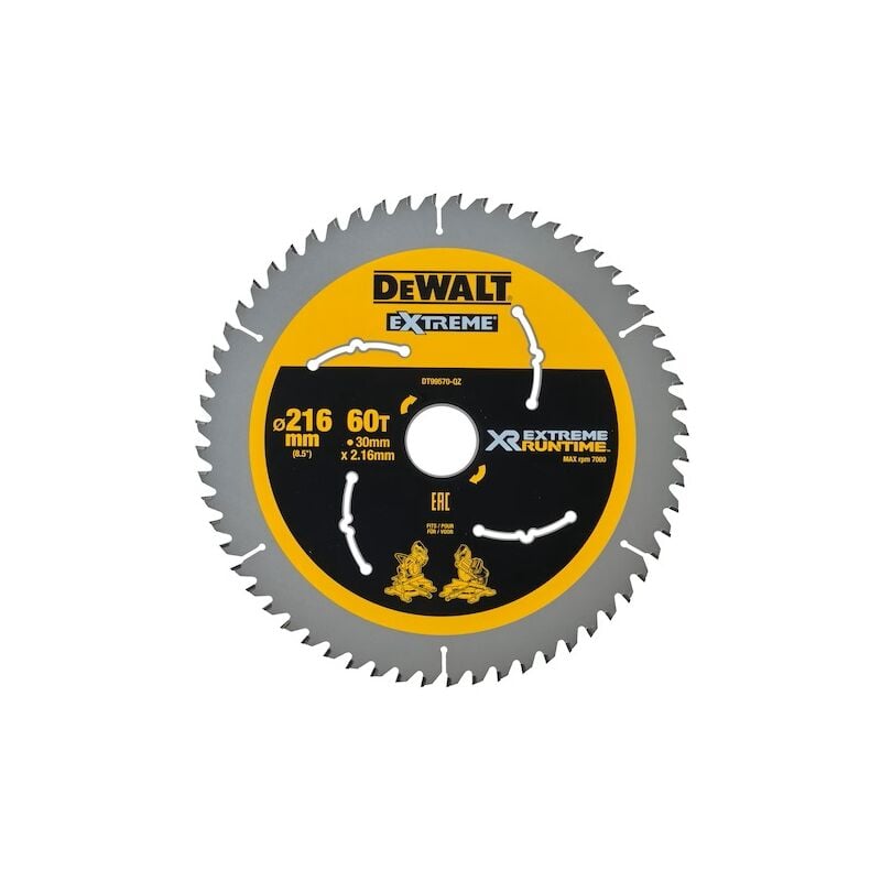 Lama per sega circolare EXTREME Runtime 216mm Alesaggio 30mm 60T Da utilizzare con la gamma XR FlexVolt e con tutte le seghe circolari, troncatrici e seghe da banco a filo e a batteria compatibiliOttimizzato per le seghe a batteria con un numero di tagli fino a due volte superiore per caricaC3 carburo di nuova generazione con fino a 3 riaffilature Le lame XR Extreme Runtime sono progettate per massimizzare la produttività quando vengono utilizzate con utensili elettrici a batteria. Specifiche Lunghezza del prodotto 27.5 in Direzione del dente In senso orario Numero di denti 60 Larghezza del prodotto 25 in Diametro foro 30 mm Diametro lama 216 mm Numero di pezzi 1 Spessore Kerf 2.16 mm Materiale di applicazione Legno Peso del prodotto 0.541 lbs
