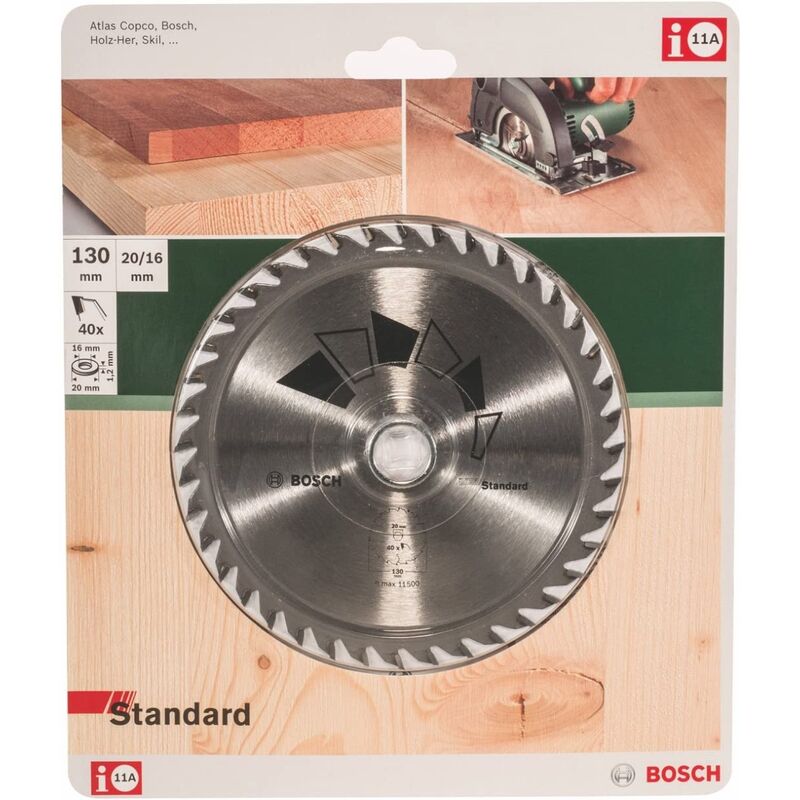 BOSCH - LAMA PER SEGA CIRCOLARE BASIC 130x1,2x20/16 MM Denti in metallo duro per stabilità e prestazioni di lunga durata Geometria denti Alternate Top Bevel (ATB) per strappi e tagli trasversali efficaci. Scanalature di dilatazione per basse vibrazioni e riduzione del rumore e del calore. Idonea per seghe circolari standard della maggior parte delle marche. Diametro lama mm: 130 Foro mm / Foro con anello riduttore: 20/16 Spessore di taglio mm: 2.2 Numero di denti: 40