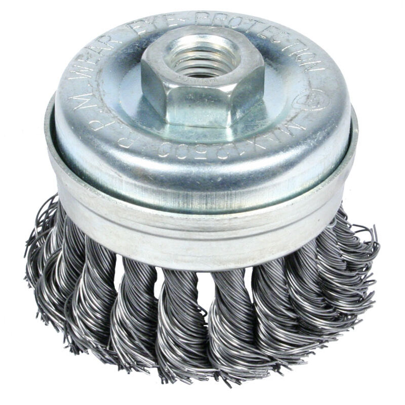 Specifiche: Diametro [mm]: 65 Montaggio: M14RPM max: 12500 Spazzola anteriore in filo Dotata di filo temprato intrecciato Filo di acciaio zincato Per rimuovere vernice, corrosione, pulire saldature, sbavatura, ecc. **Le foto sono solo a scopo illustrativo.