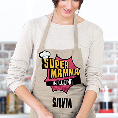 LaMAGLIERIA Grembiule personalizzato uomo donna tuo nome Super Mamma in cucina, Natural