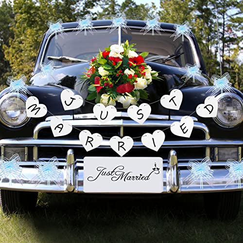 Decorazione perfetta per il matrimonio: lo striscione per auto just married è una bellissima decorazione per il matrimonio, con nastri e adesivi azzurri freschi, è pieno di atmosfera romantica. È una decorazione essenziale per un'auto da matrimonio, riempiendo l'atmosfera romantica ovunque.