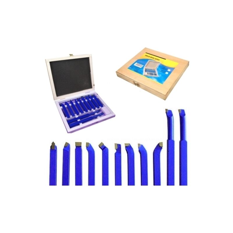 Lame/Utensili in acciaio con trattamento al tungsteno per troncatura a tornio/mini tornio 6mm in box di legno set 11 pz con varie inclinazioni.