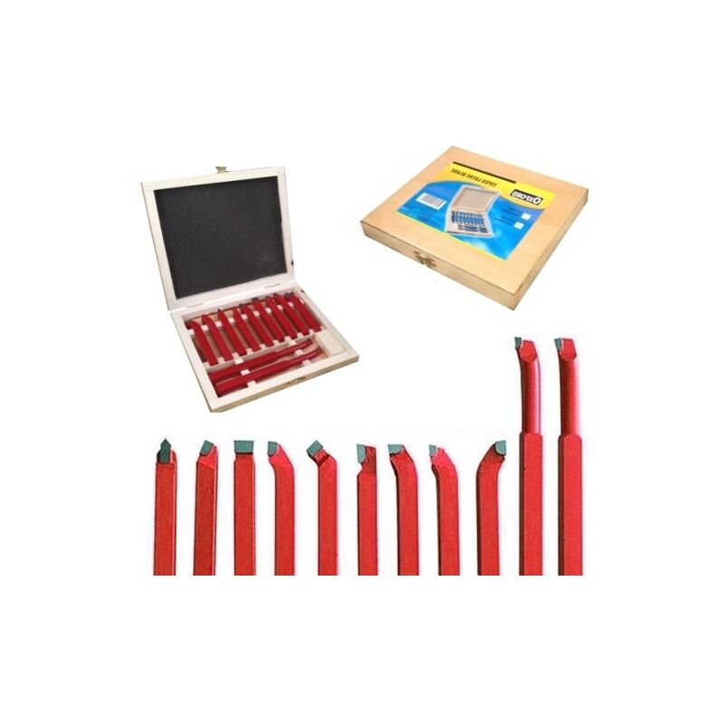 Lame/Utensili in acciaio con trattamento al tungsteno per troncatura a tornio/mini tornio 10mm in box di legno set 11 pz con varie inclinazioni.