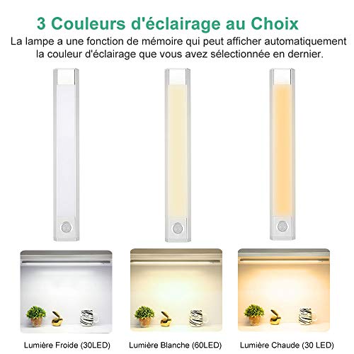 【3 colori di illuminazione super luminosi】 Contiene 60 LED ultra luminosi a risparmio energetico, tra cui 30 luci calde, 30 luci pure per illuminare facilmente gli spazi bui. Sotto le modalità Sempre ON e Rilevatore di movimento e di notte, premere a lungo l'interruttore per 2 secondi per cambiare il colore della luce. Luce pura (30 LED), luce calda (30 LED), luce naturale (luce pura e luce calda accendono contemporaneamente 60 LED).