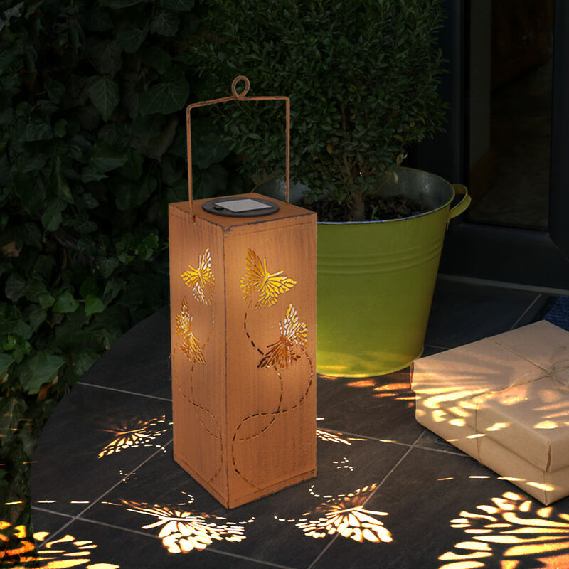 Descrizione Questa lampada solare in metallo color ruggine ricorda un design antico. La lampada solare quadrata (10,2x10,2 cm) con un'altezza di 26 cm convince con il bellissimo motivo a farfalla traforato, che rende la luce da 4000K unica. L'area esterna è illuminata per un massimo di 8 ore. Con grado di protezione IP44, questa luce solare è ideale per l'uso all'aperto. L'illuminante a LED è già installato in modo permanente nella lampada. Dettagli lampada • Tipo di apparecchio: lampada solare • Materiale: metallo • Colore: ruggine • fustelle • Batteria inclusa: sì • Grado di protezione: IP44 • Lunghezza x larghezza x altezza in cm: 10,2x10,2x26 • Illuminante: 1x LED • Lampadine incluse: sì • Tempo di combustione: circa 8 ore
