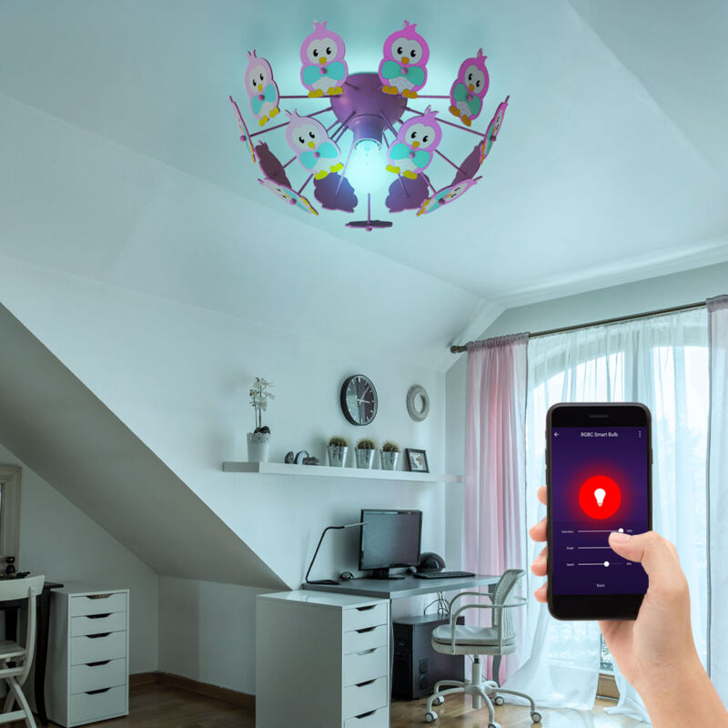 Descrizione Plafoniera con gufi per la cameretta dei bambini. Rendi felici i tuoi bambini con questa lampada dal design accattivante! Si adatta perfettamente ad ogni cameretta e stanza dei giochi ed è dotata di attacco E27 per garantire un'illuminazione ottimale con una lampadina adatta. I gufi devono ancora essere avvitati agli infissi fissati alla base. Grazie alla lampadina inclusa, puoi gestire facilmente la lampada dal divano utilizzando l'app o il controllo vocale. Puoi utilizzare l'app per impostare il timer con diversi giorni della settimana e orari, nonché diversi programmi di illuminazione. Nella fornitura è inclusa una lampadina LED Smart RGB. Lampada dettagli • Tipo di luce: plafoniera • Materiale base: metallo • Colore: rosa • Materiale gufo: legno, colorato • Numero di gufi: 15 • Grado di protezione: IP20 • Diametro x altezza del paralume in cm: 41,5 x 18 • Attacco: 1x E27 • Lampadine incluse • Potenza: 8,5 watt • Flusso luminoso: 806 lumen • Colore della luce: bianco