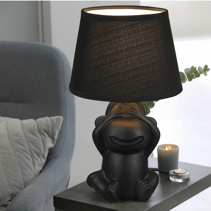 Descrizione La divertente lampada scimmia in ceramica diventerà sicuramente la tua nuova lampada preferita. Il paralume in tessuto abbinato crea un'illuminazione accogliente e discreta con un fattore sorriso. La luce può essere comodamente accesa e spenta tramite un interruttore a filo. Grazie al design a colori in nero, la lampada si distingue e diventa un moderno elemento abitativo che dà piacere. La lampadina non è inclusa nella fornitura. Particolare lampada • Tipo di lampada: lampada da tavolo • Motivo: Scimmia che si copre gli occhi • Materiale: ceramica, tessuto • Colore nero • Grado di protezione: IP20 • Classe di protezione: 2 • Interruttore a filo • Diametro x altezza in cm: 17 x 27 • Peso: 0,51 kg • Presa: 1x E14 • Lampadina inclusa: No • Potenza della lampada: 1x massimo 40 watt • Tensione: 230V, 50Hz