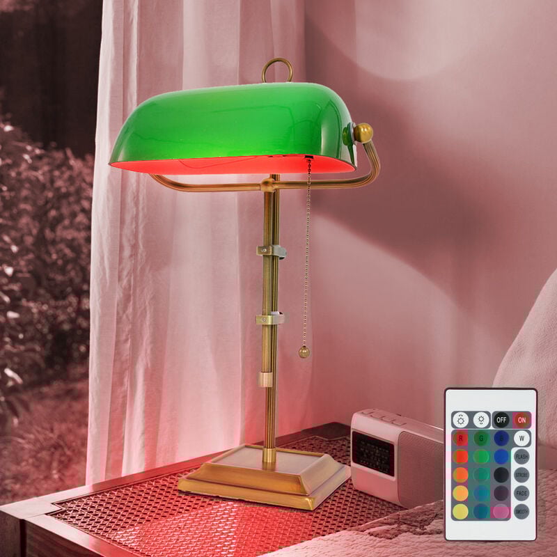 Descrizione Lampada da tavolo classica in bronzo nello stile della lampada da banchiere. Con questa lampada puoi portare un tocco nostalgico nelle tue quattro mura. La base della lampada in ottone è completata da un elegante paralume in vetro verde. Per garantire un'illuminazione ottimale, il paralume può essere regolato in base alle proprie esigenze. Utilizzando il telecomando incluso, la lampadina LED RGB può essere regolata su diversi colori, fornendo così un'illuminazione suggestiva. Nella fornitura è inclusa una lampada LED RGB con telecomando per luce bianca e controllo RGB. Lampada dettagli • Tipo di lampada: lampada da tavolo • Materiale: metallo • Colore: bronzo • Paralume orientabile • Interruttore • Lunghezza x larghezza x altezza in cm: 26,5x25x56 • Prese: 1x E27 • Lampadine incluse: sì • Potenza lampada: 1x 9 watt • Flusso luminoso: 1x 806 lumen • Colore della luce: bianco caldo • Telecomando: Solo per la lampada • Alimentazione: 220-240V, 50-60Hz Dettagli lampadine