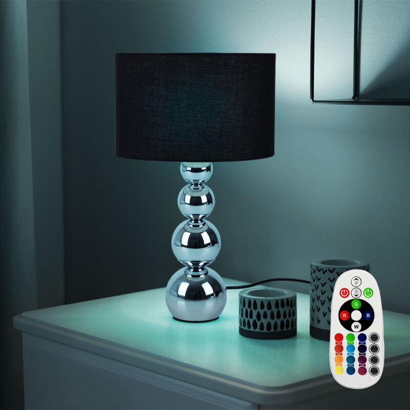 Descrizione Questa lampada da tavolo classica è dotata di un paralume nero. Il paralume nero è completato da una base della lampada composta da quattro sfere metalliche di diverse dimensioni poste una sopra l'altra. Molto adatta come illuminazione d'atmosfera sul comò o sul tavolino. Con il dimmer tattile la lampada da tavolo può essere regolata su 3 livelli toccandola nel punto designato. Utilizzando il telecomando in dotazione è possibile impostare la lampada su diversi colori e fornire così un'illuminazione suggestiva. Nella fornitura è inclusa una lampada LED RGB con telecomando per luce bianca e controllo RGB. Lampada dettagli • Tipo di lampada: lampada da tavolo • Materiale: metallo, tessuto • Colore: cromo, nero • Dimmer touch a 3 livelli • Grado di protezione: IP20 • Lunghezza cavo in cm: 150 • Diametro x altezza in cm: 25 x 43 • Attacco: 1x E14 • Lampadine incluse • Potenza lampada: 1x 4,8 watt • Flusso luminoso: 1x 470 lumen • Colore della luce: bianco caldo + modalità