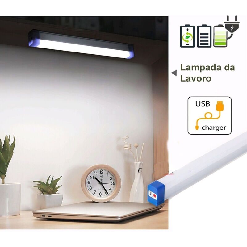 Lampada Emergenza LED 32cm Magnete Ricaricabile USB Torcia Lavoro Portatile Lampada a led ideale come torcia portatile, lampada di emergenza e barra sottopensile. Caratteristiche tecniche: Lampada Emergenza Tecnologia: LED Tipo led: 2835 Temperatura: 6000K Colorazione Luce: bianco freddo Gancio laterale Tastino On-Off cambio modalità illuminazione Batteria interna al litio Ricaricabile USB Ingresso 5v Doppia calamita laterale 3 Modalità di illuminazione: Luce fissa, luce alternata, luce soffusa Colore: bianco opaco e blu Dimensioni: 32h x 4 s cm circa Lunghezza cavo di alimentazione: 20 cm circa Peso: 0.130Kg La confezione contiene: Nr. 1 lampada Nr. 1 cavo di alimentazione Nr. 2 adesivi per calamita
