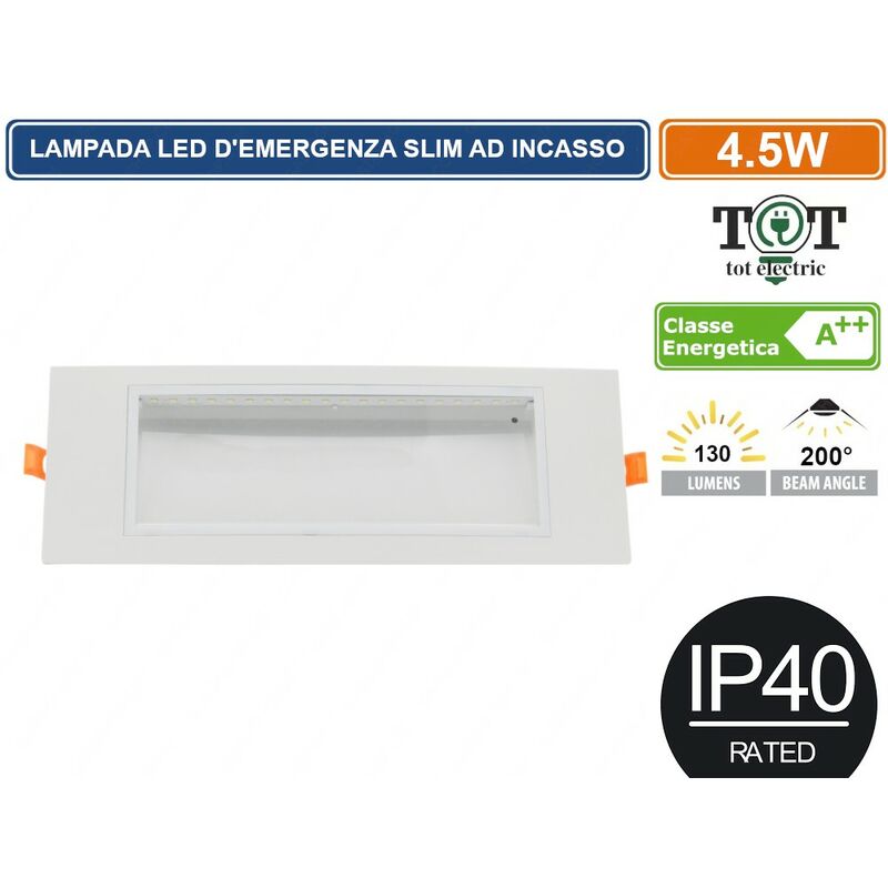 Lampada d'Emergenza slim con potenza di 4,5W e 3 ore di autonomia. Lampada realizzata in ABS di colore bianco e copertura opaca in plastica. LED SMD con fascio luminoso di tipo diffuso e flusso luminoso di 130 lm. Facile da montare, grazie alla connessione tramite morsetti a vite. Nella confezione riceverete 2 molle per il fissaggio ad incasso. Se connessa alla rete elettrica, si accenderà automaticamente in caso di interruzione della stessa, garantendo una durata minima di 3 ore. La batteria interna da 3.7V e 1800MA (18650 Lithium Battery) si ricarica in 24 ore quando completamente scarica (al primo utilizzo si consiglia di farla ricaricare per 36 ore). Dimensioni: 295 x 100 x 28 mm.