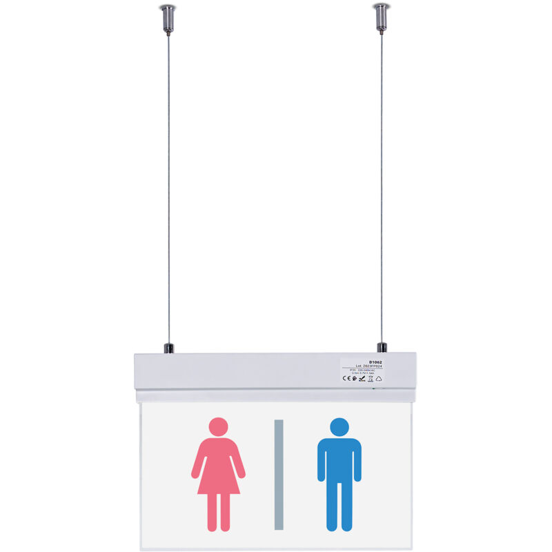Lampada di emergenza permanente a sospensione, con pittogramma in acetato che indica la posizione dei servizi igienici. Questo apparecchio rimane sempre acceso, anche in caso di interruzione di corrente, offrendo fino a 3 ore di autonomia. Con indicatore di funzionamento a LED. È facile da installare a soffitto e comprende tutti gli elementi necessari.