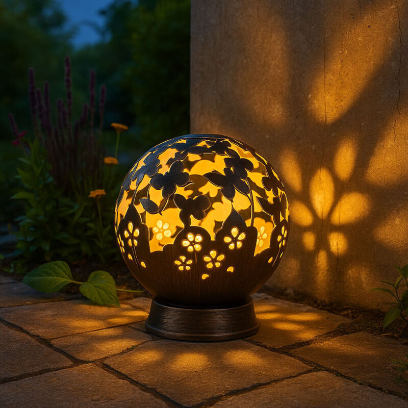 Descrizione La luce solare rotonda colpisce per la sua bella punzonatura decorativa e trova un posto adatto in ogni giardino. Grazie alla caratteristica sferica e al motivo stampato a forma di bellissime farfalle, la lampada crea un gioco di luci unico nel tuo giardino e patio. La luce solare riempie le ore di sole con la sua energia e può poi emetterla di nuovo nelle ore serali con una bella luce. Il metallo spazzolato nero conferisce alla lampada un tocco retrò e ne sottolinea il design unico. L'illuminante a LED è già installato permanentemente nella lampada. Particolare lampada • Tipo di lampada: solarelampada da esterno • Materiale: metallo • Colore nero • Grado di protezione: IP44 • Diametro x altezza in cm: 20 x 21 • Illuminante: 1x LED (installato in modo permanente) • Lampadina inclusa: Sì • Potenza lampada: 1x 0,06 watt • Temperatura colore: 1x 3000 Kelvin • Colore chiaro: bianco caldo • Tensione: 1,2 V Dettagli lampadine • Tipo di sorgente luminosa: LED • Consumo
